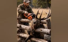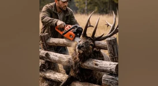 A majestic wild elk found itself in a perilous situation, hopelessly entangled within a sturdy wooden fence in a vast, open field. A Desperate Struggle The enormous bull elk, with…