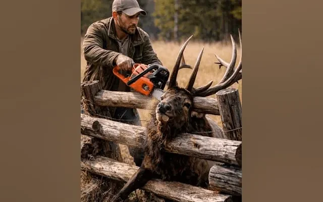 The enormous bull elk, with its impressive rack of antlers, was visibly distressed, its powerful body pinned by the rustic fence. Its struggles to free itself only seemed to worsen its predicament, highlighting the immediate danger it faced in the wilderness.